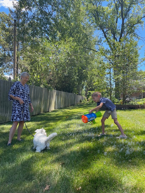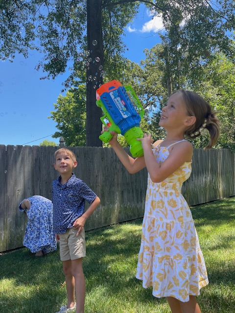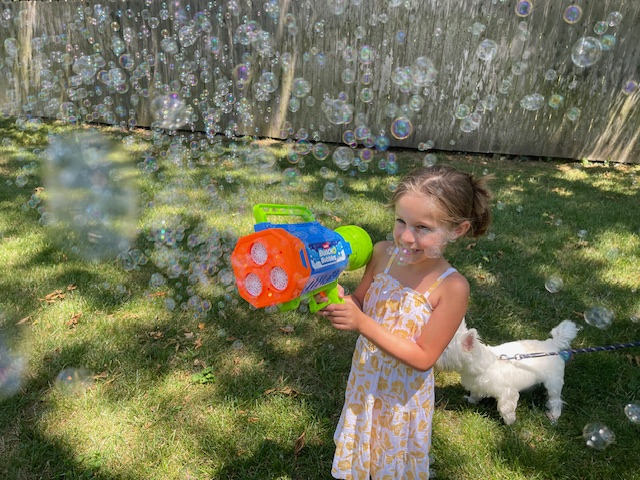 After church we all went home and the OM barbecued burgers and hot dogs. Daughter #1 brought a bubble blaster from Costco which was a big hit. Mr. Smith was in dog heaven frolicking with the twins.