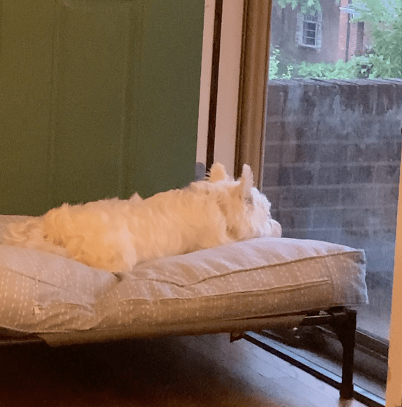 We picked up Mr. Smith at the kennel, but it was pouring rain and he freaked out, becoming enraged by the windshield wipers. I talked him down from the ledge and we made it home, thankfully, without wrecking the car, and daughter #1 retrieved him after returning from her DAR workshop. He was happy to be back home again and at his post…