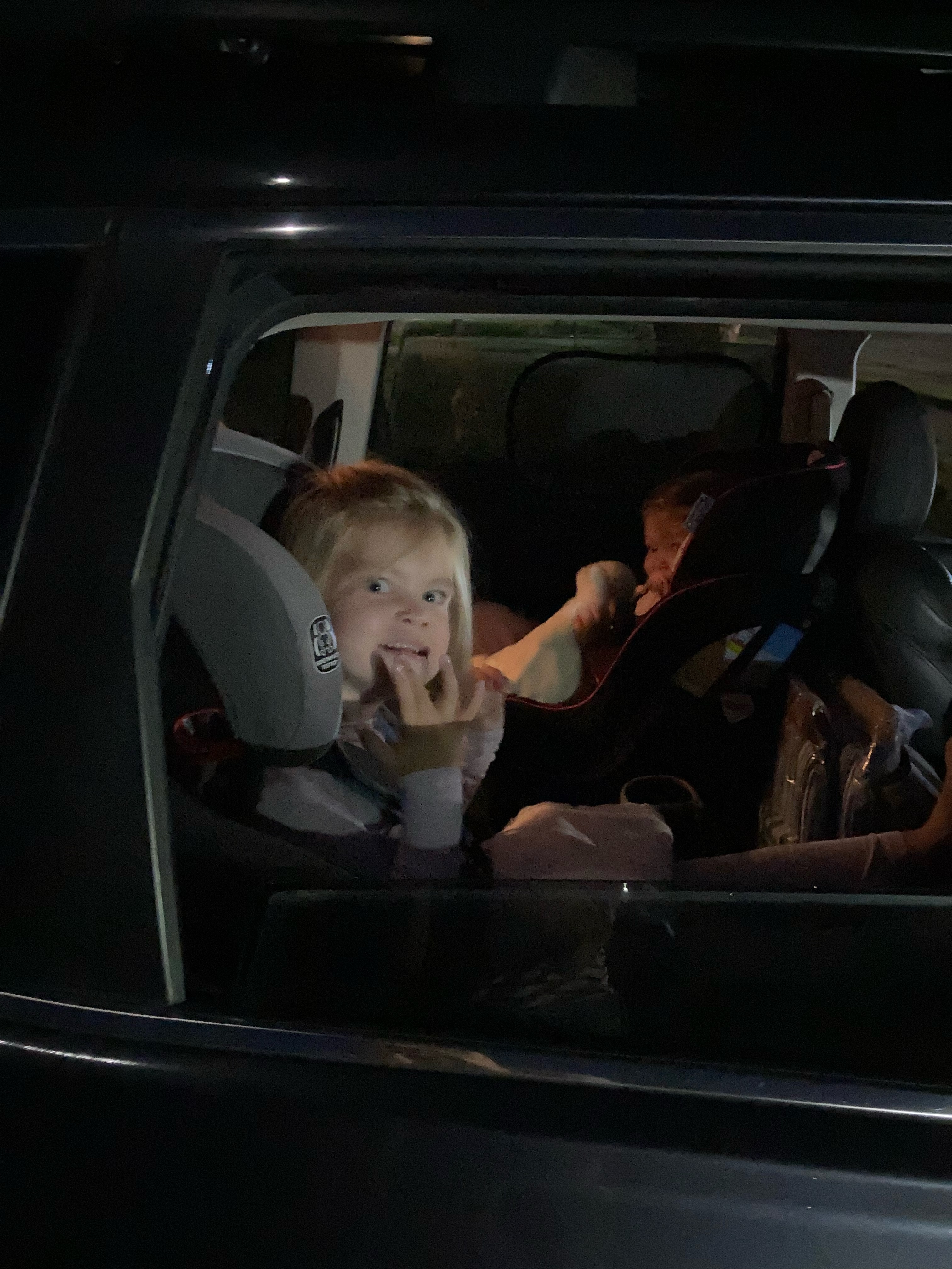 I remember those days–leaving before dawn to get a jump on the driving while the kids sleep! (Note both babes are wide awake.)