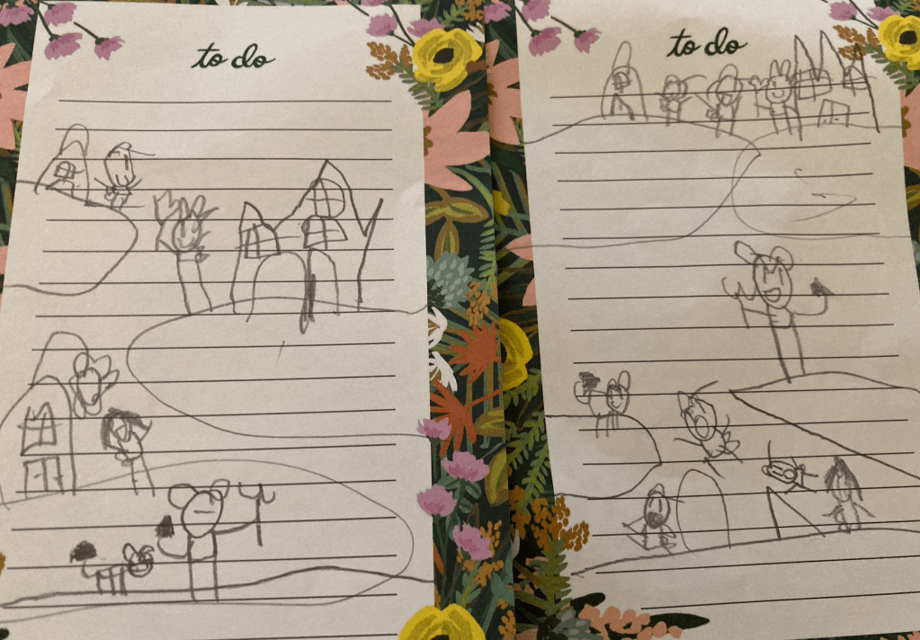 On Sunday the OM and I picked up the twins to take them to church with us since their parents are very busy getting ready to move. It had been awhile since the twins had been to church so they needed to re-learn some church behavior basics. They did pretty well. The bud drew some interesting pictures…note the devil prominently portrayed in hell…