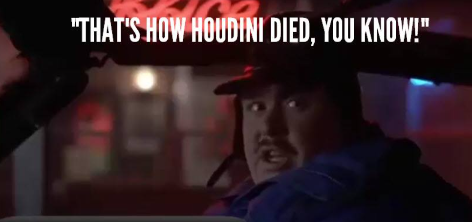 In an ironic twist, Harry Houdini died on this day in 1926 from peritonitis (swelling of the abdomen), possibly related to appendicitis and possibly related to punches to his abdomen he had received about a week and a half earlier.