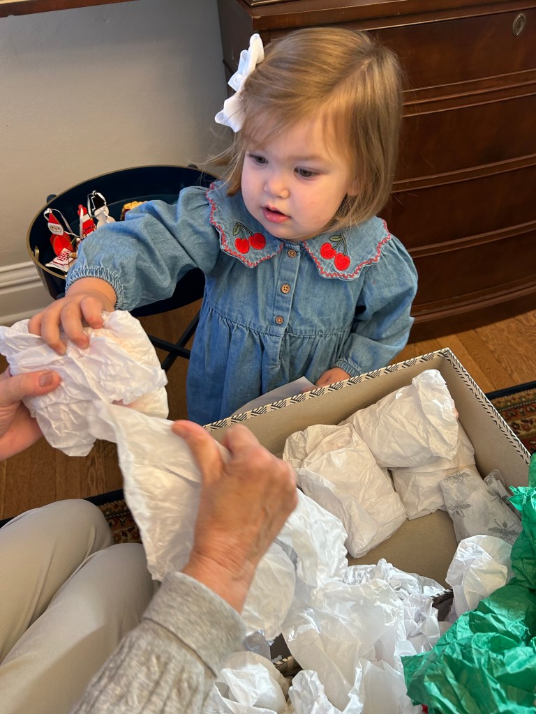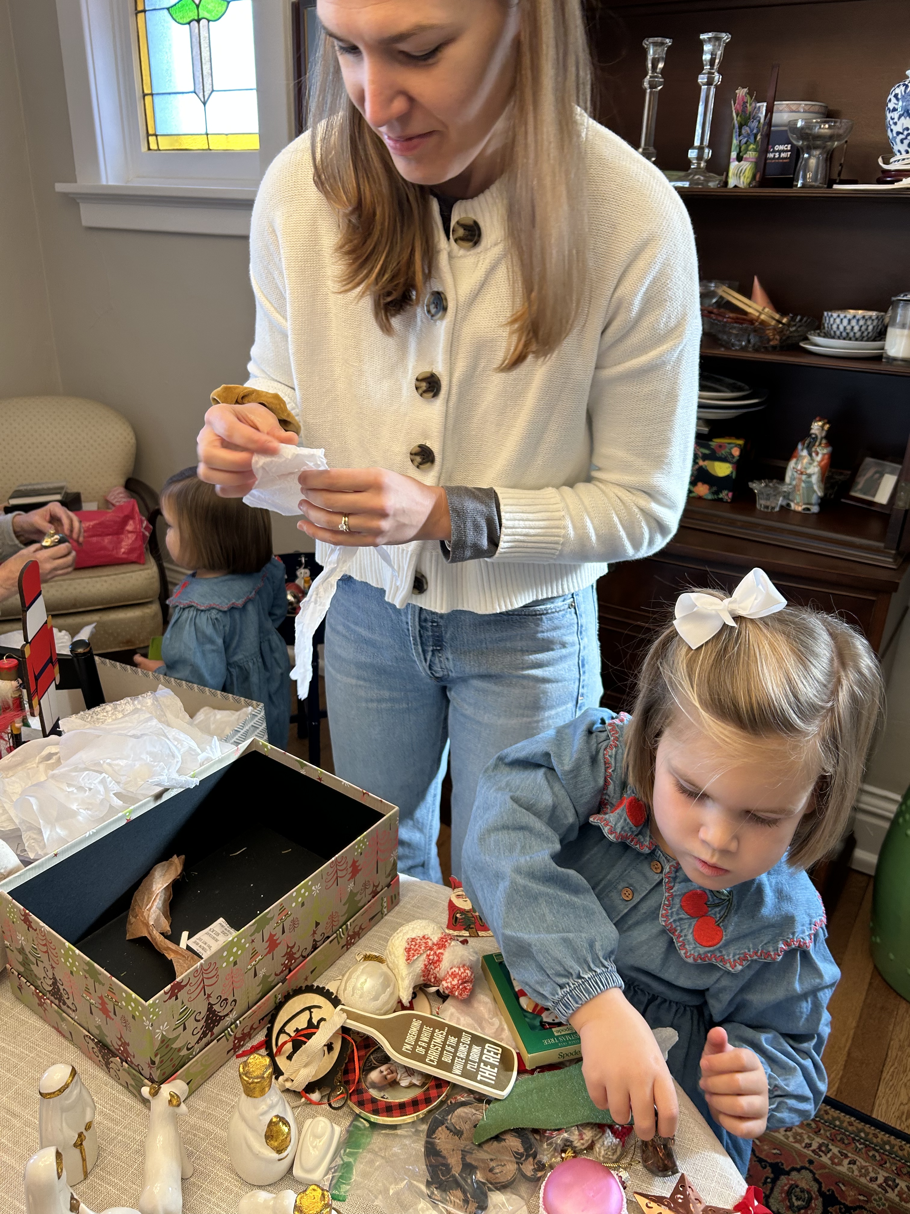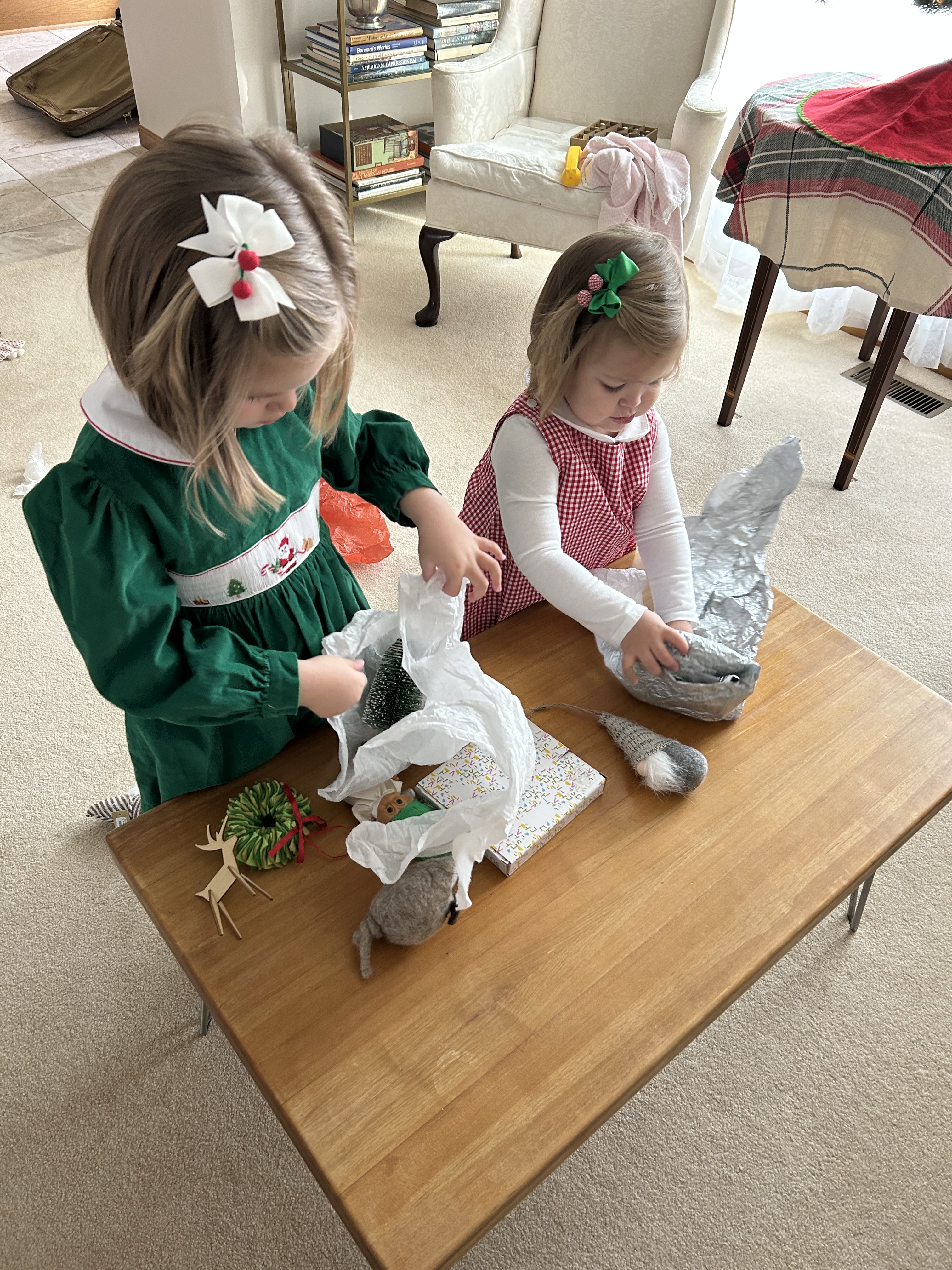 Then it snowed all day Saturday–enough to change everyone’s plans and stay home. We had started unpacking Christmas things at daughter #1’s house on Friday morning with the prairie girls…