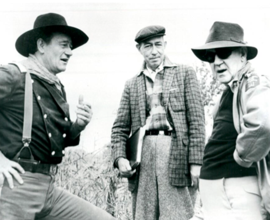 At the moment I am reading another historical novel by another American writer who wrote short stories for magazines while working in a hardware store in his hometown of Bloomington, IL. Harold Sinclair also wrote a few well-received novels, but The Horse Soldiers was his only bestseller. I have my father’s old signed copy from 1955 and I am enjoying it. Of course, the movie version starring John Wayne and William Holden is a favorite of mine. Here’s a picture of the author with John Wayne and the director John Ford.