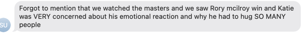 I didn’t get a chance to watch any of the Masters this year, but I was happy that Rory McIlroy finally won. He has had a difficult few years and I’m glad he pulled it together! Golf is such a difficult mind-game. I got a big kick out of 4-year old Katie’s reaction to his win: