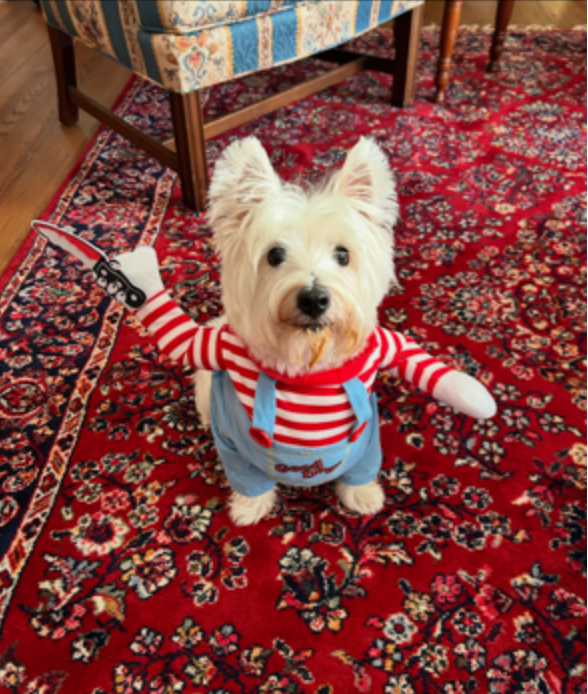 (That’s peanut butter around his mouth–bribery to get him into his costume! It took two of us and he went full terrier on us.)