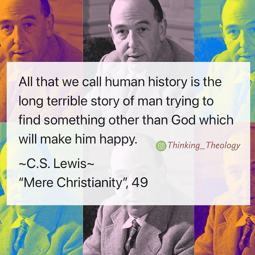 “Your real, new self (which is Christ’s and also yours, and yours just because it is His) will not come as long as you are looking for it. It will come when you are looking for Him. Does that sound strange? The same principle holds, you know, for more everyday matters. Even in social life, you will never make a good impression on other people until you stop thinking about what sort of impression you are making. Even in literature and art, no man who bothers about originality will ever be original whereas if you simply try to tell the truth (without caring twopence how often it has been told before) you will, nine times out of ten, become original without ever having noticed it. The principle runs through all life from top to bottom, Give up yourself, and you will find your real self. Lose your life and you will save it. Submit to death, death of your ambitions and favourite wishes every day and death of your whole body in the end submit with every fibre of your being, and you will find eternal life. Keep back nothing. Nothing that you have not given away will be really yours. Nothing in you that has not died will ever be raised from the dead. Look for yourself, and you will find in the long run only hatred, loneliness, despair, rage, ruin, and decay. But look for Christ and you will find Him, and with Him everything else thrown in.”
