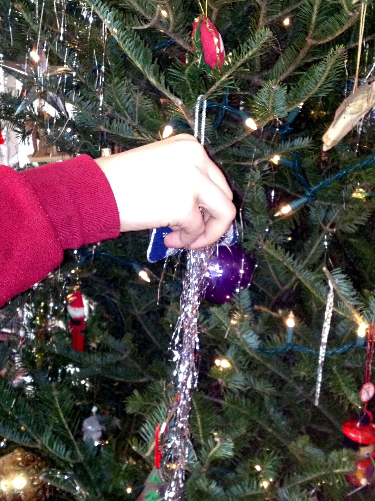 Here is daughter #2 with a handful of tinsel, flaunting the Bunker Cameron rule of one strand of tinsel per branch, which our mother stuck to religiously as well. We laughed about it, but still…