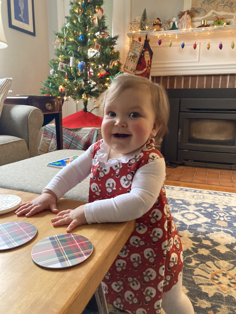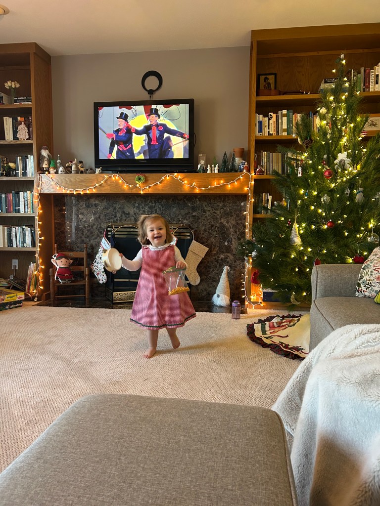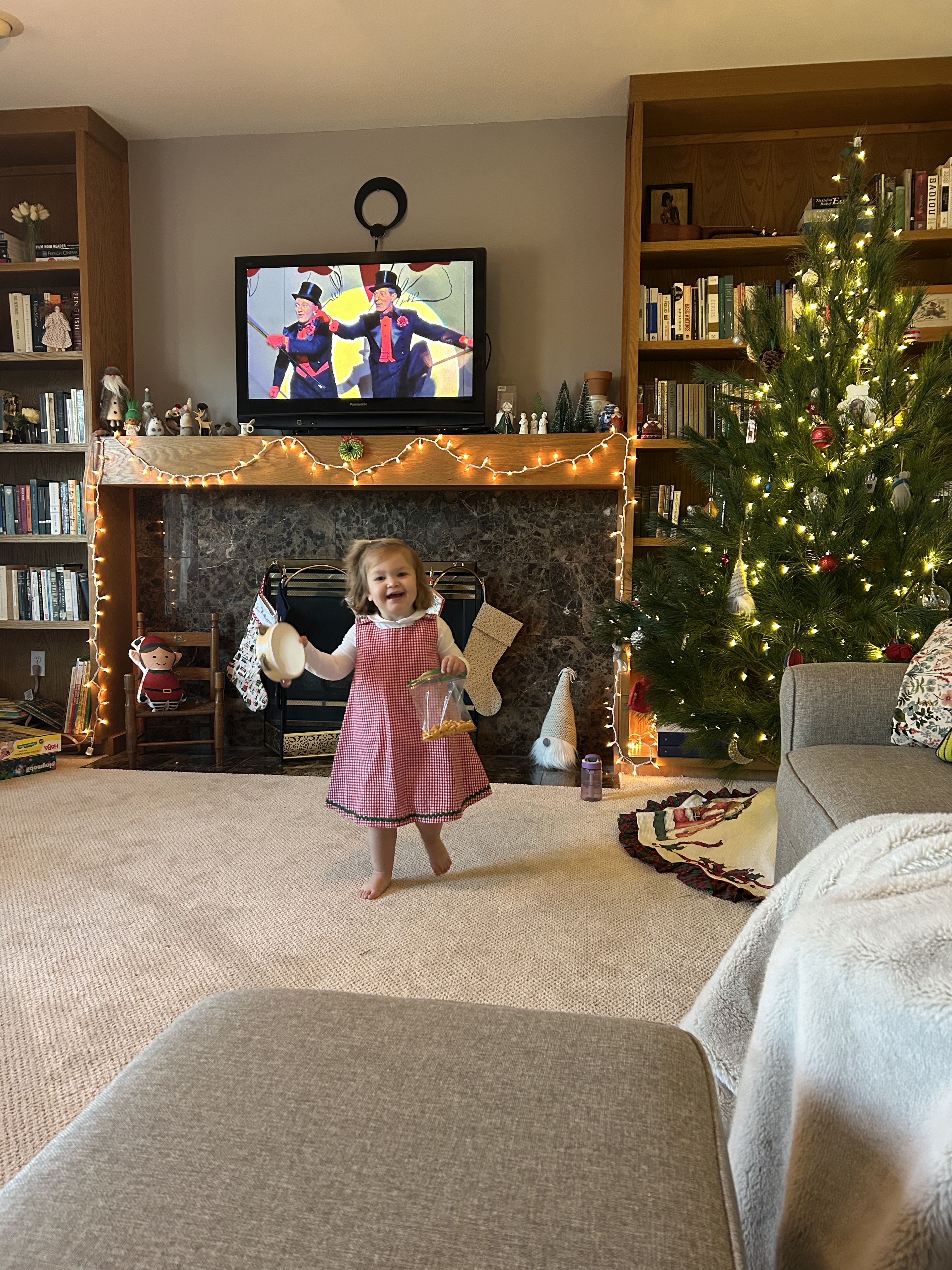 For her part, Ida has enjoyed Christmas music and always amuses us with her dance moves, which center in her hips. She can’t help but dance, no matter how busy she is with something else (crawling, cruising, jail-breaking, wreaking general havoc). When we watched White Christmas, she stopped in her literal tracks when Bing Crosby sang his first note. (I have since heard multiple other accounts of children doing this!) Admittedly, she is still a big fan of The Beach Boys. (You may recall that when she was a wee babe, DN sang “Surfin’ I-D-A” to her, to much delight.)