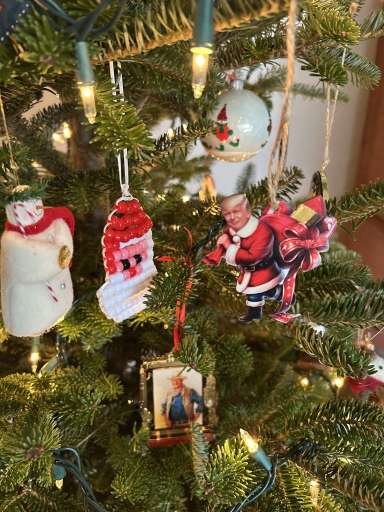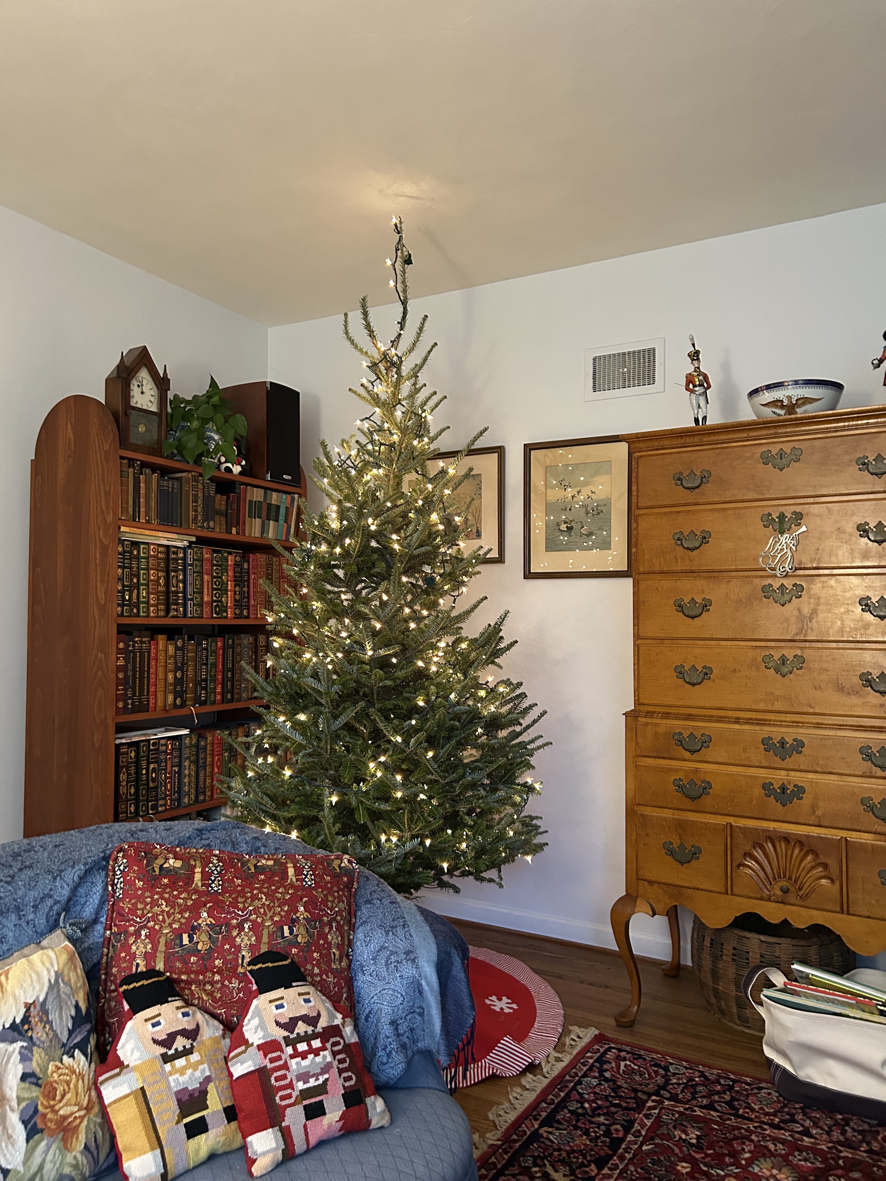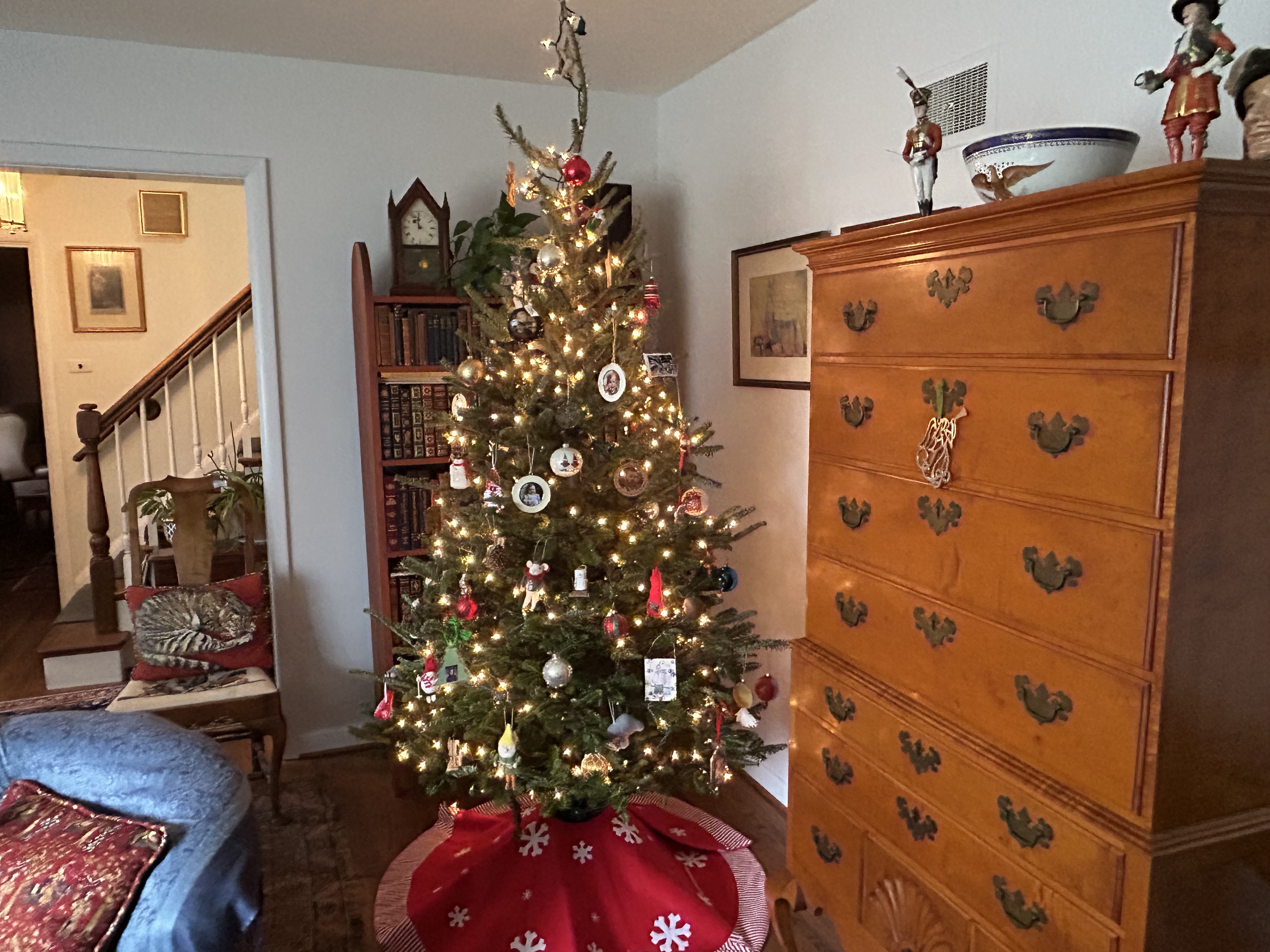 It was a group effort. The boy came over Thursday evening to carry the tree in from the garage and put it in the stand. The OM and I strung the lights on Saturday morning. And daughter #1 came over after her DAR luncheon to help decorate it. Ain’t it lovely?