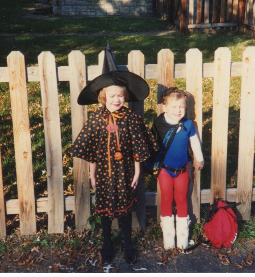 Well, it’s that time of year again when the old Halloween pictures come out, much to the chagrin of some people. Here is a picture of daughter #1 (age 5) and the boy (not quite 3) in 1989. Daughter #1 is (yet again) a witch, wearing the costume my mother made for her a few years earlier. The boy is (of course) a super hero. He is happily wearing his sister’s leotard and tights and her old white snow boots, which he loved and wore frequently–and why not? They were the next best thing to cowboy boots. He is also wearing the Batman kerchief (as a cape) that he wore every day to school that year. Yes, the boy always displayed a unique personal style.