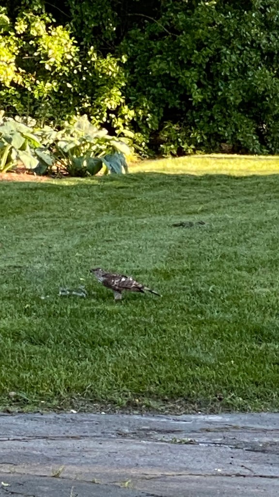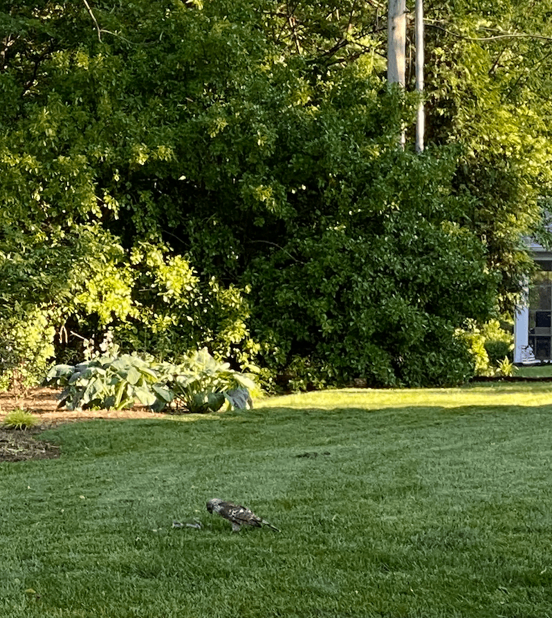 We went home and opened a bottle of rosé in the Florida Room. However, Mother Nature intruded traumatically on our wine time. A large hawk flew into the forsythia bushes bordering the south windows, pounced on some small creature (which screamed) and then crashed into the metal wall. We jumped up and saw the hawk on the ground as it collected itself and finished off the poor creature (a baby rabbit? a bird?). It then flew into the neighbor’s yard and tore into its victim as we watched. Homicide: Life in the Backyard.