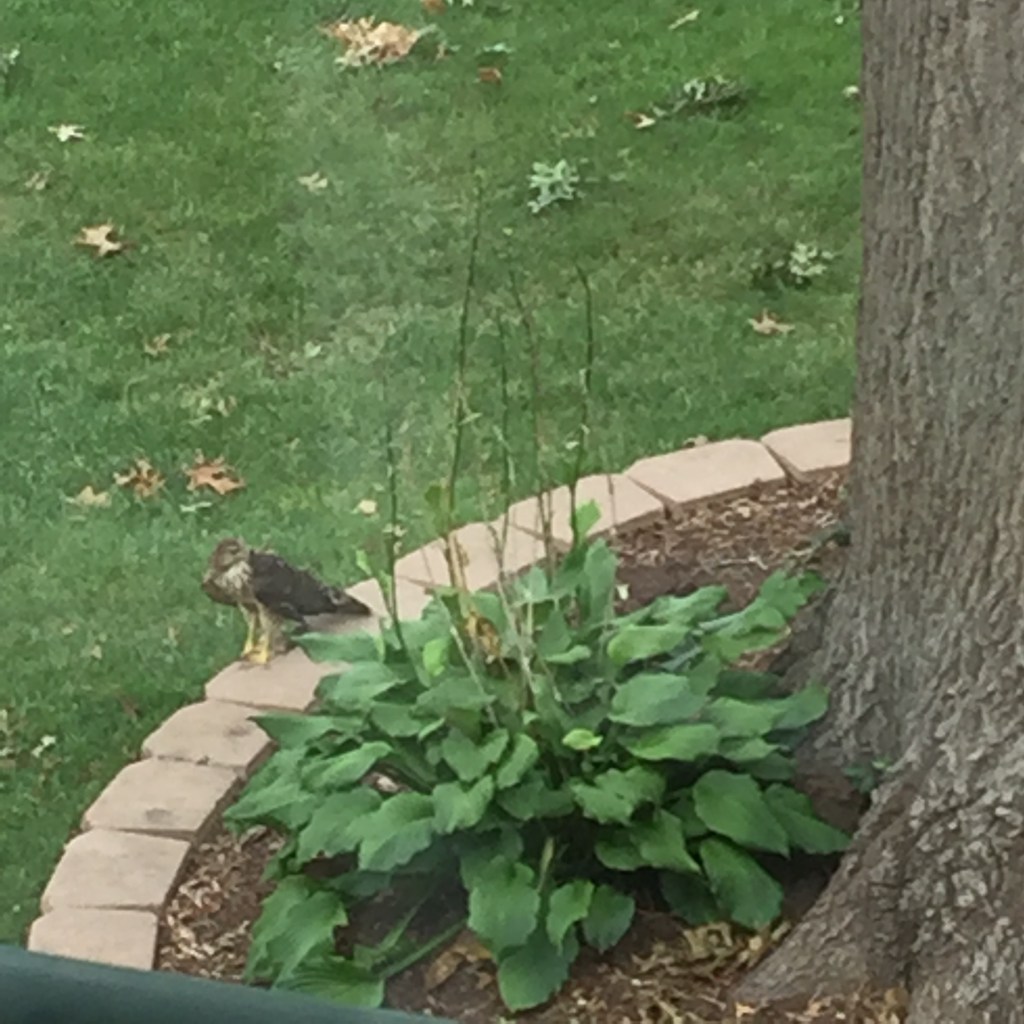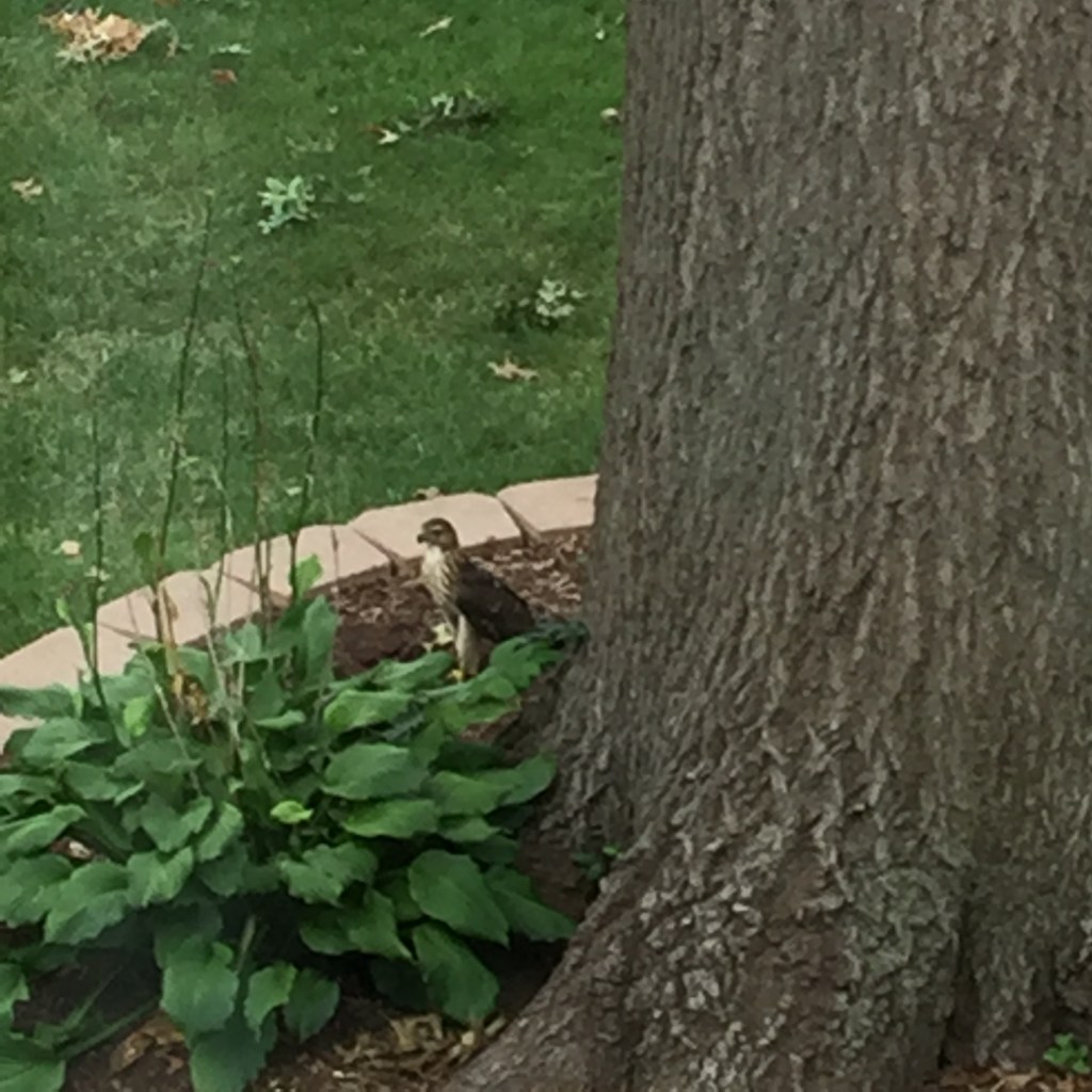 Clearly the squirrel was messing with the hawk’s mind. He would hide under the Hosta and then dart out and up the tree. The hawk would fly around the tree and the squirrel would go back under the Hosta.