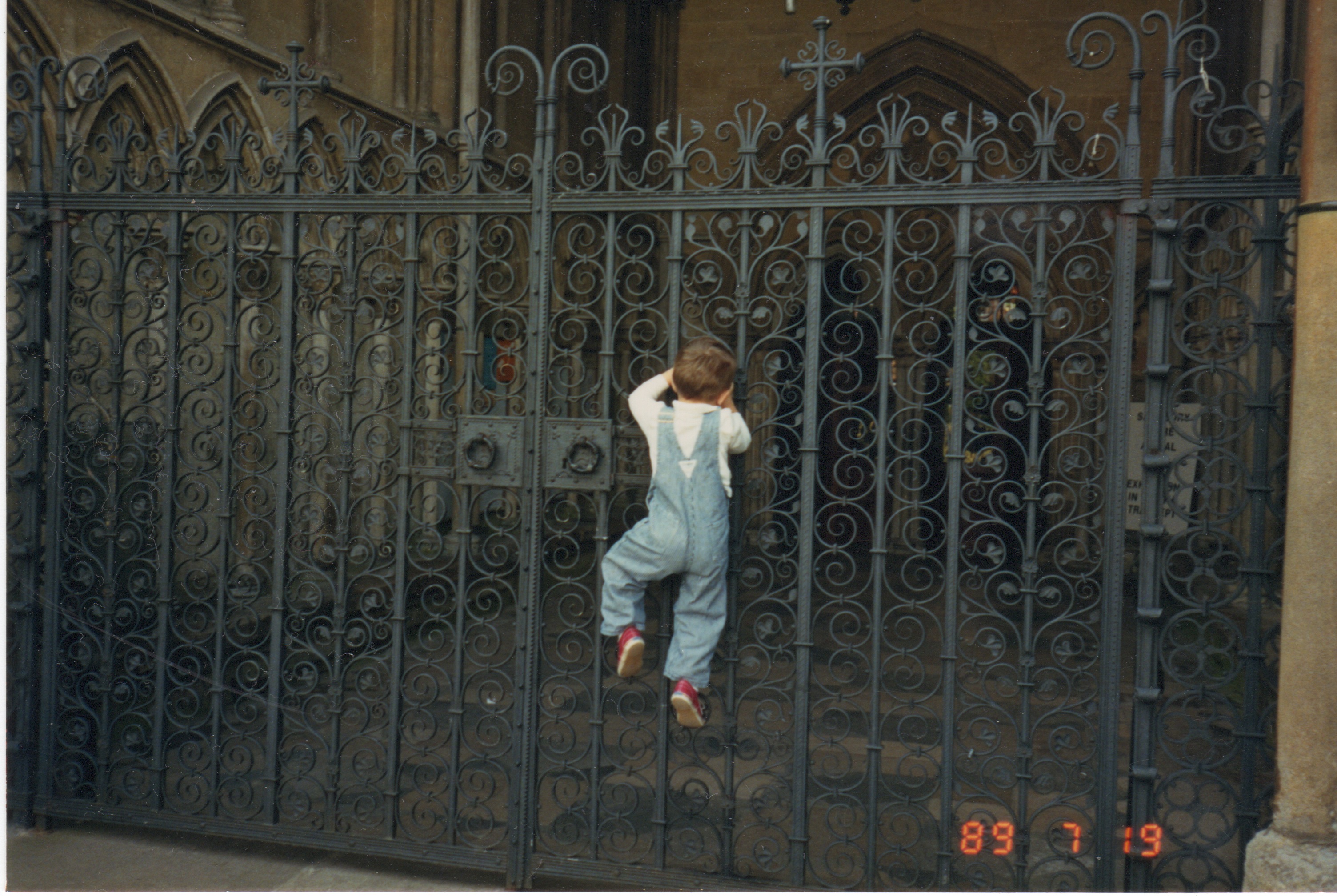 The other day I blogged about Old Sarum and New Sarum. Here is a picture of the boy at New Sarum (Salisbury Cathedral) in 1989, trying to climb up the grill, apparantly desperate to get into the church. Quelle monkey! He was 2 1/2 and wearing his engineer overalls and red Keds. A fashion plate even then.