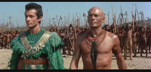 The plot here, such as it is, has to do with a Mayan king (George Chakiris of the amazing hair) who escapes ferocious invaders by boat (with his people, including Richard Basehart, Shirley Anne Field and Brad Dexter) to a new land, where he meets up with Black Eagle (Yul Brynner), a Native American. Uh huh.